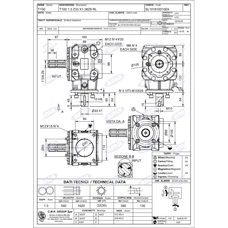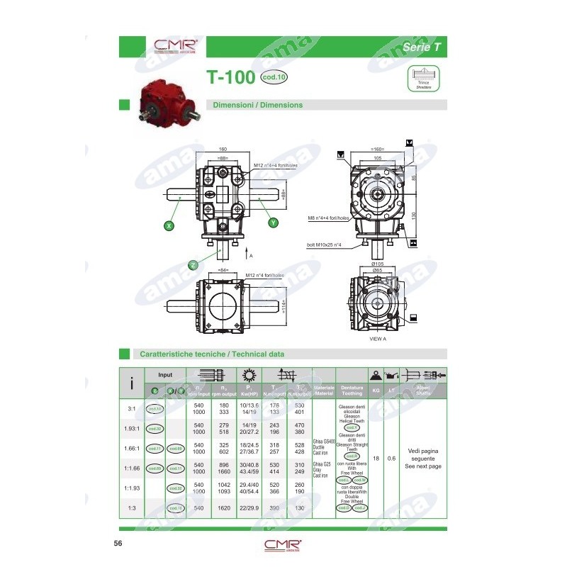 Wykonana z trwałego żeliwa, przekładnia gwarantuje wytrzymałość i odporność na intensywną pracę. Jest przystosowana do pracy z mocą do 22 kW (30 KM), co czyni ją odpowiednią dla wielu typów kosiarek. Odpowiada numerowi porównawczemu COMER T310L