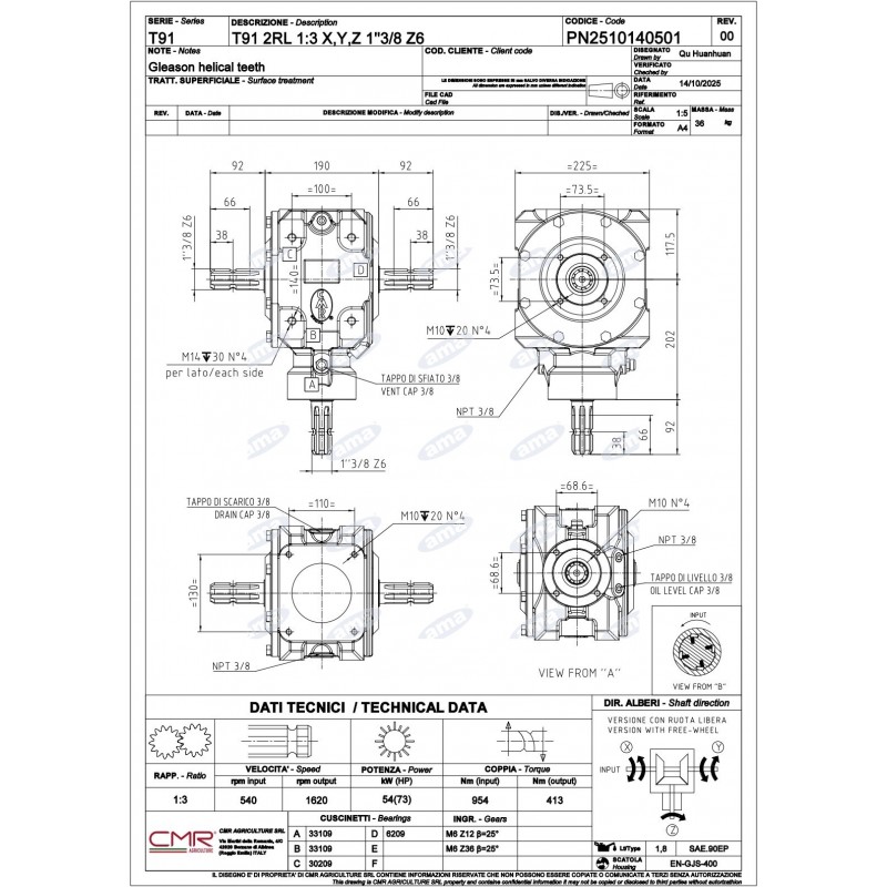 Wykonana z trwałego żeliwa, przekładnia gwarantuje wytrzymałość i odporność na intensywną pracę. Jest przystosowana do pracy z mocą do 54 kW , co czyni ją odpowiednią dla wielu typów kosiarek.